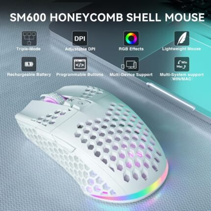 SOLAKAKA SM600 Honeycomb Shell Gaming Mouse Wireless,Tri-Modes BT/2.4G Wireless/Type-C Wired Gamer Mouse with 2 Side Buttons, Macro Programmable and RGB Light for PC/Mac/Laptop,Black