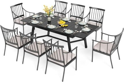 PHI VILLA 9 Pieces Outdoor Dining Set for 8, 84″ Long Expandable Metal Table & Heavy-Duty Wrought Iron Chairs with Cushions, Large Furniture Set for Patio, Deck, Yard, Porch – Black