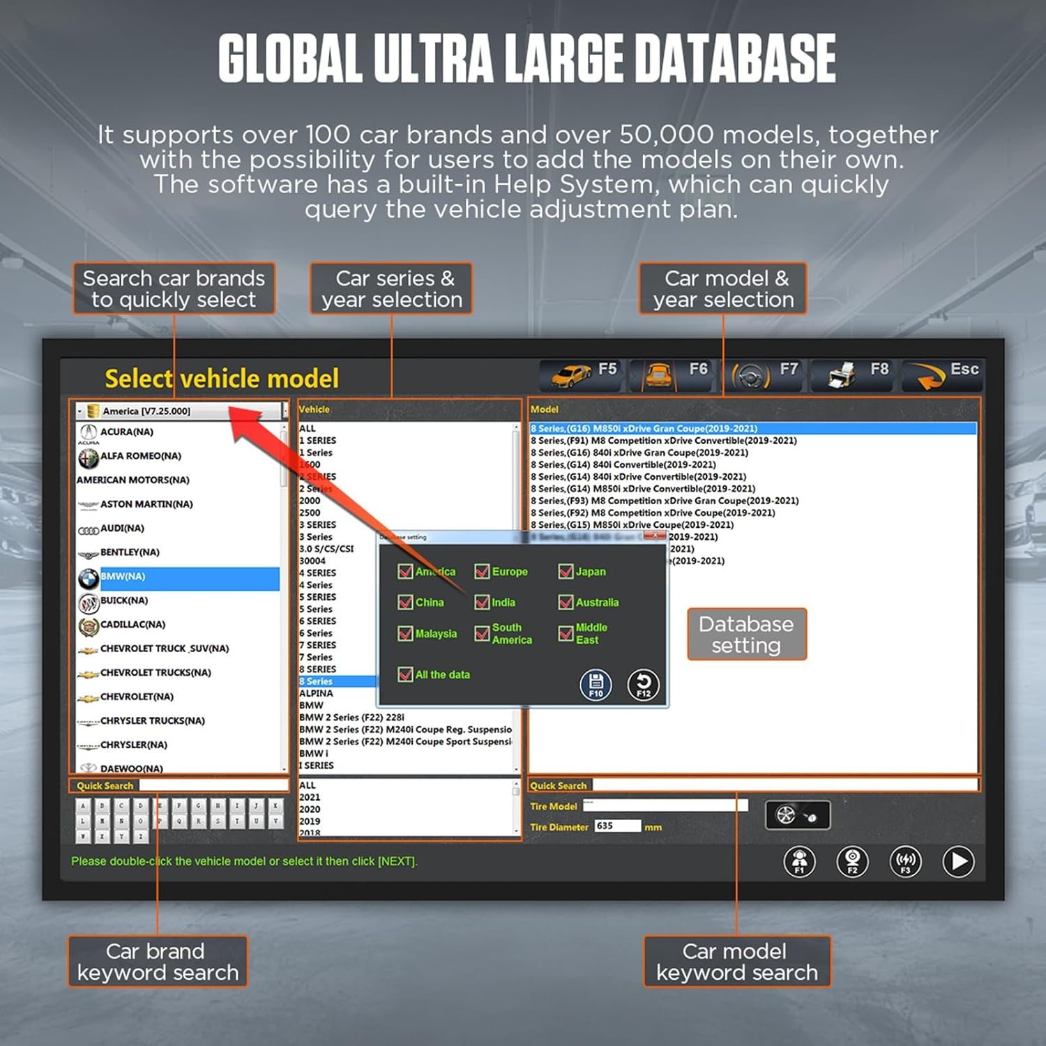 【Widely Used】Measurement system for full vehicle body dimension,this tire machine supports various measurements including toe -in, camber,steering axle inclination, caster, thrustangle, track width, track width diff, wheelbase, and wheelbase diff. It supports over 100 car brands and over 50,000 models, together with the possibility for users, to add the models on their own. The software has a built-in Help System, which can quickly query the vehicle adjustment plan.