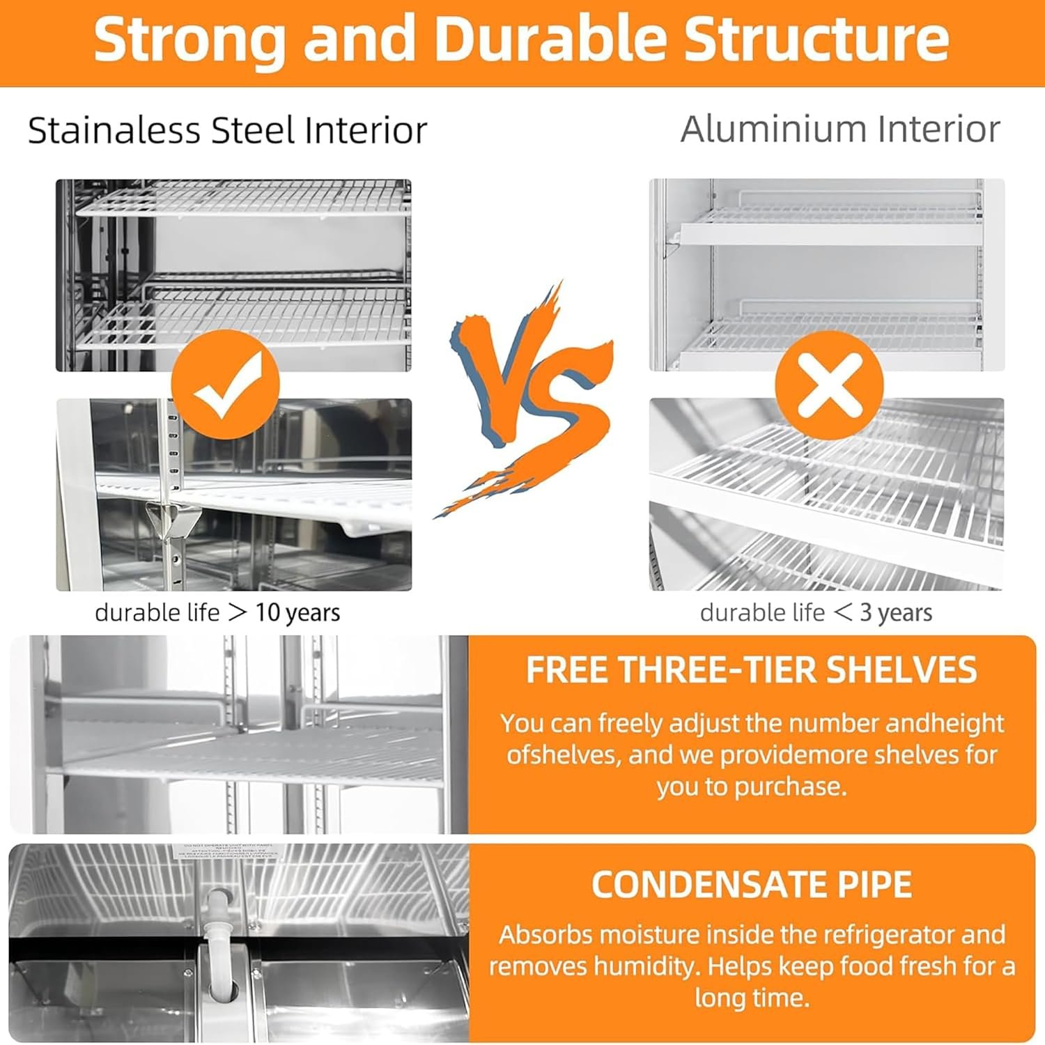 【Professional structure】This commercial refrigerator is made of S/S430 fingerprint-free stainless steel throughout the interior, making it overall sturdy and easy to clean, and 4 universal heavy-duty casters( 2 brakes)make our commercial refrigerator easy to move and stable to stand on. Built-in LED lighting and a 90° automatic door closing mechanism with two door locks make it easier to view and store items safely