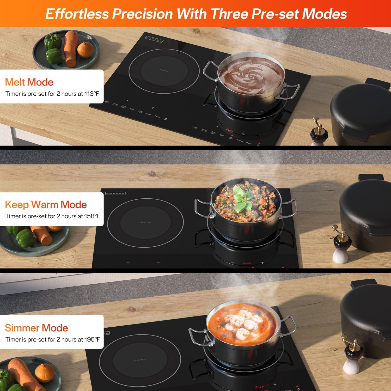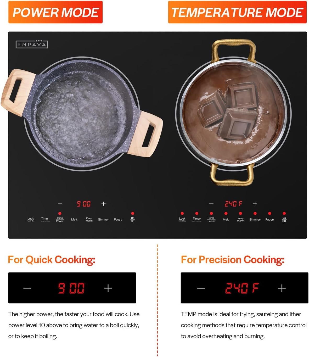 Ultimate Cooking Flexibility: Empava’s 2-burner induction cooktop offers precise temperature control from 120°F to 460°F, accommodating a range of cooking techniques. Whether you’re simmering, melting, or keeping food warm, adjust to the perfect heat with ease .