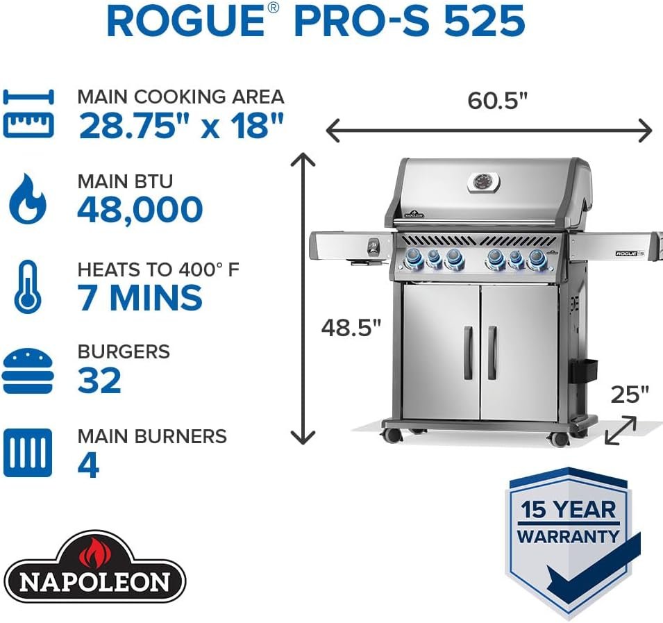 Napoleon Rogue PRO-S 525 Propane Gas Grill with Infrared Side and Rear Burners, Stainless Steel, Durable 6-Burner BBQ