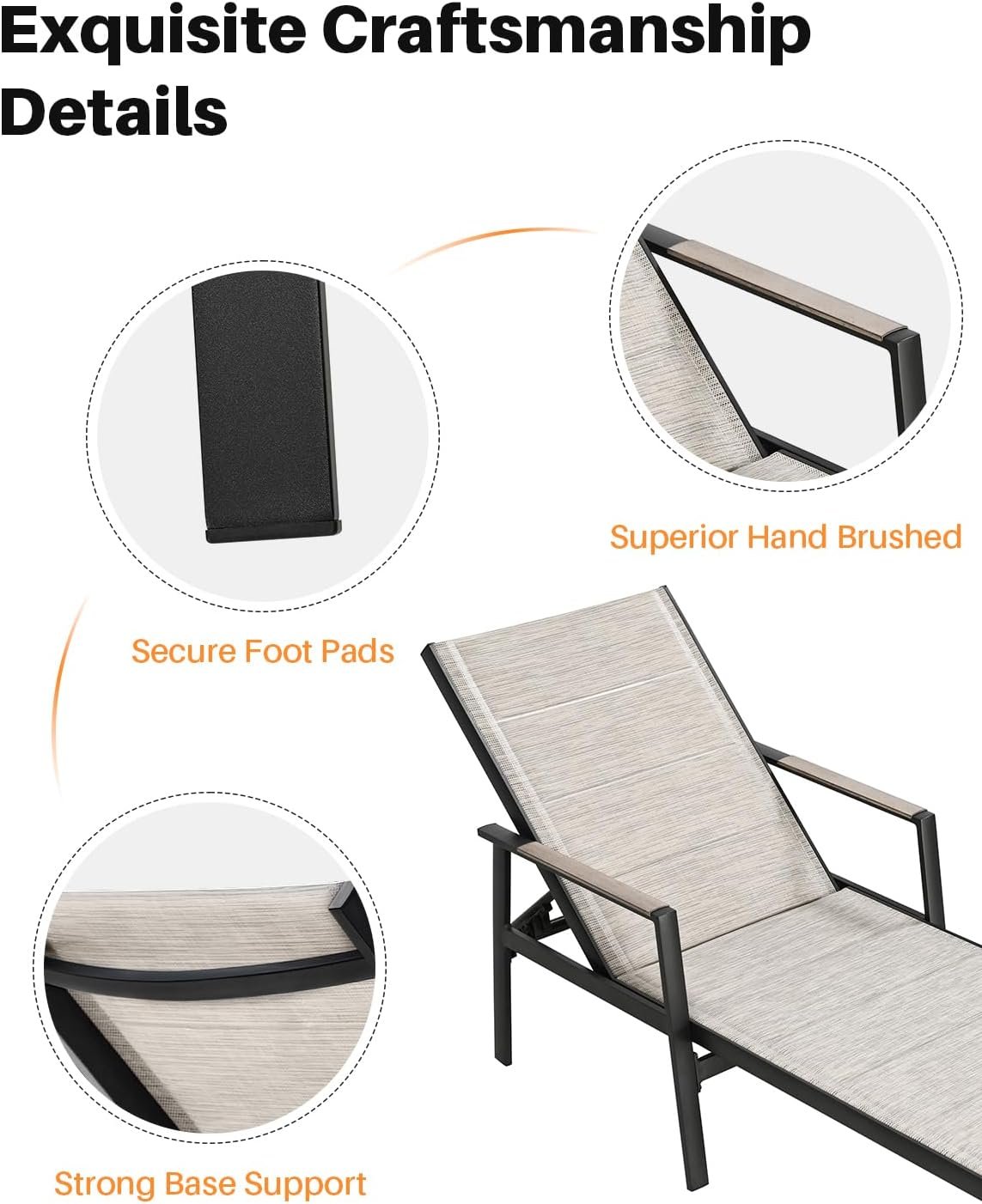 6-POSITION RECLINING DESIGN WITH HAND-BRUSHED ARMS: Customize your outdoor seating with two lounge chairs, each featuring six secure reclining positions designed to support your back at different angles. Expertly hand-brushed armrests add a natural wood-look texture while offering comfortable arm support and refined detailing, creating a cohesive, high-end appearance across the set.