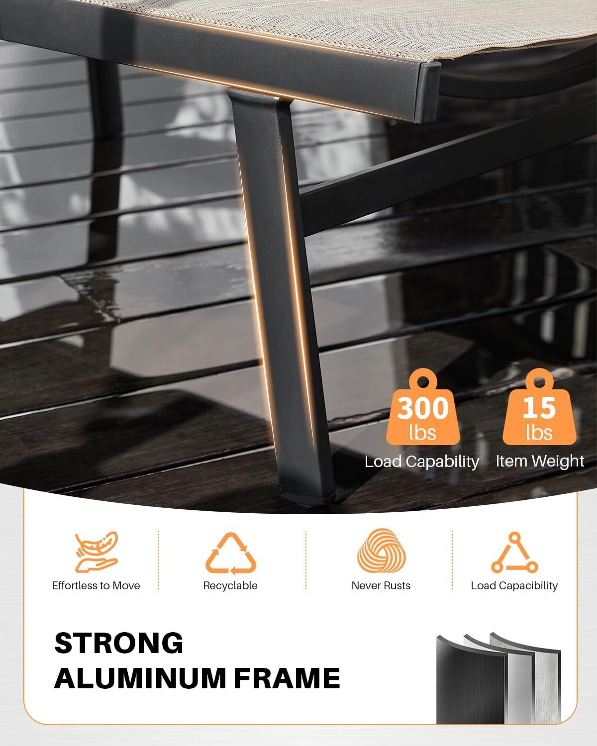 NEVER-RUST ALL-ALUMINUM STRUCTURE: Each chaise lounge is built with a premium aluminum frame that never rusts and resists corrosion, providing long-term stability and reliable support. The environmentally friendly powder-coated finish enhances durability and preserves a clean, polished look, giving both loungers a strong foundation for the textilene seating and dependable performance over time.