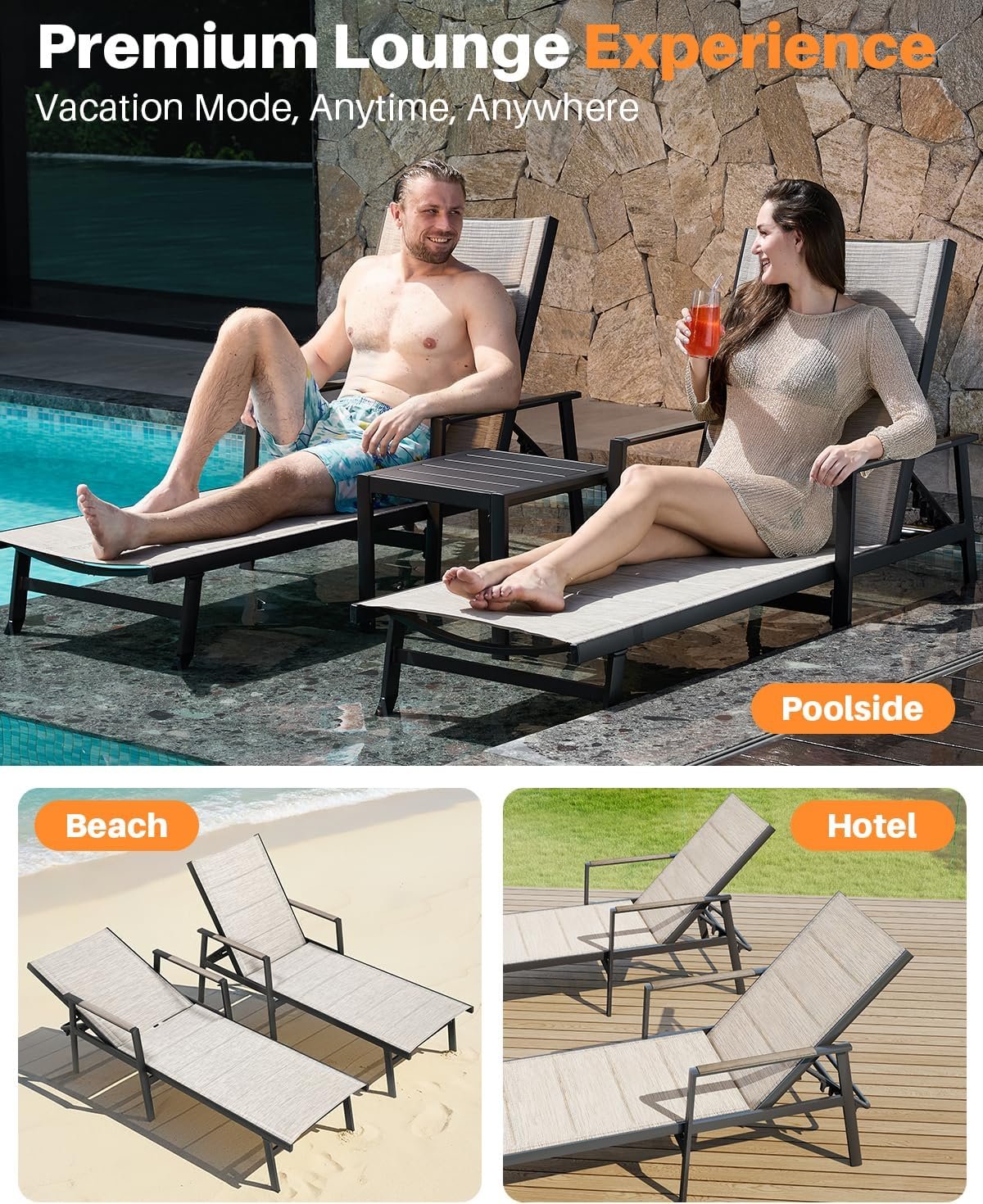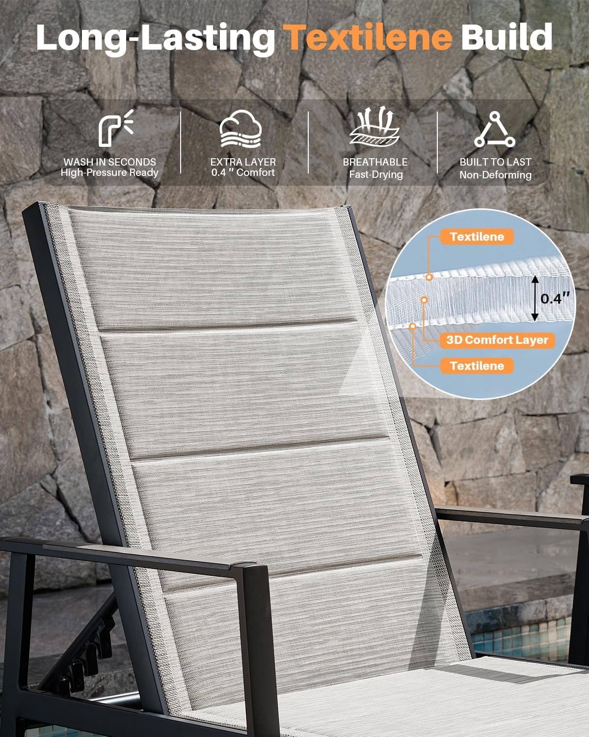 HIGH-PRESSURE WASHABLE & FAST DRYING: Designed for real outdoor use, the upgraded textilene surface on both lounge chairs supports high-pressure washing, allowing dirt, sunscreen, sweat, or light spills to be removed in just seconds. The fast-drying, fade-resistant fabric maintains its color and texture over time, making cleaning simple and efficient while keeping both loungers durable and visually appealing.