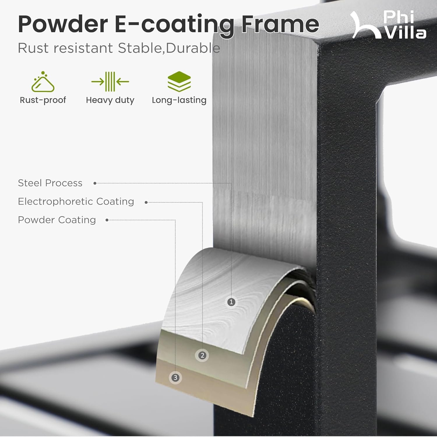 E-coating is a high-tech process by which electrically charged particles are deposited out of a water suspension to fully coat a metal surface to avoid rust, furniture with this exclusive treatment is definitely worth your choice, especially for people living near the coast with salty and moist air.