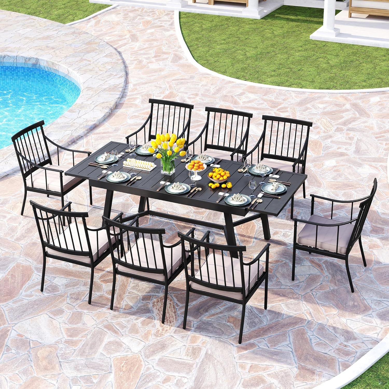 8 reviews for PHI VILLA 9 Pieces Outdoor Dining Set for 8, 84″ Long Expandable Metal Table & Heavy-Duty Wrought Iron Chairs with Cushions, Large Furniture Set for Patio, Deck, Yard, Porch – Black